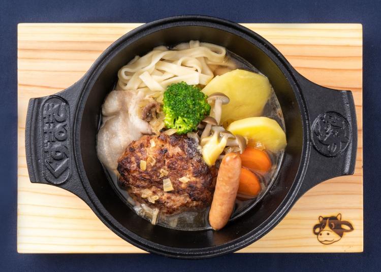 这道单锅菜肴利用了久住町丰富的当地特产,如肉类、蔬菜、奶制品和红酒,还加入了久住町的扁平面条 Hibogahatto。