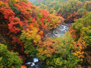 著名的不动瀑布(Fudo Falls)是一个三层瀑布,是日本最著名的 100 个瀑布之一,也是岩手县 20 个最佳瀑布之一。15 米高的瀑布震撼着周围宁静的空气,白色的水花垂直落下,景象十分壮观。据说不动瀑布曾是苦行僧的道场,如今这个宁静的地方仍保留着这种氛围,瀑布中央供奉着石雕的不动明王像。