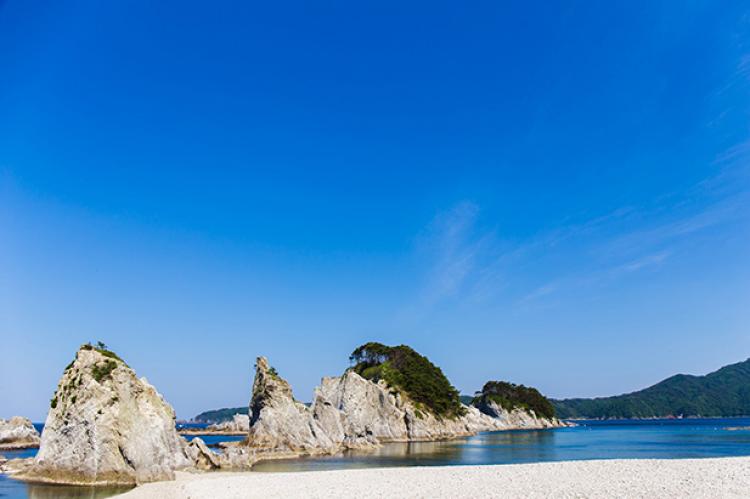 浄土ヶ浜の地名は約300年前に宮古山常安寺七世の霊鏡和尚が「さながら極楽浄土のごとし」と感嘆したことから名づけられました。平成13年にはかおり風景100選、平成18年には日本の快水浴場百選 海の部特選に選定されています。