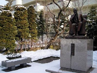 「願わくはわれ太平洋の橋とならん」と念願した郷土の生んだ国際人、新渡戸稲造没後50年を記念して、盛岡市が下の橋町の生誕の地に、市民の浄財で建立したもの(作者 朝倉文夫)。太平洋戦争中はその業績は殆ど無視され、その遺徳を一部の人達が偲ぶだけでしたが、戦後、その役割が正しく見直され太平洋の両岸で再評価されています。