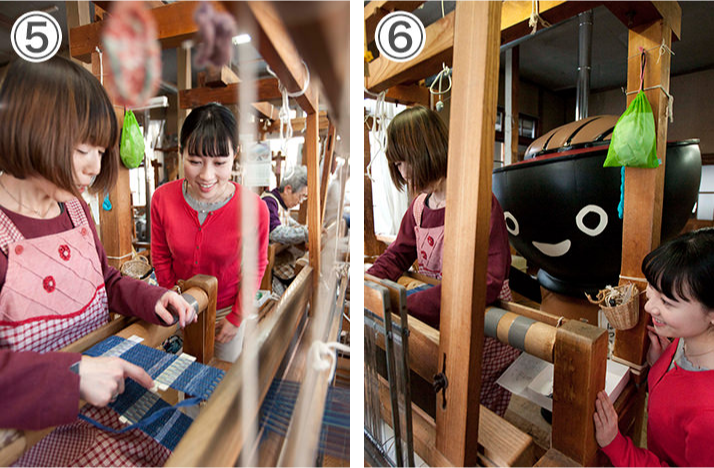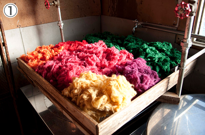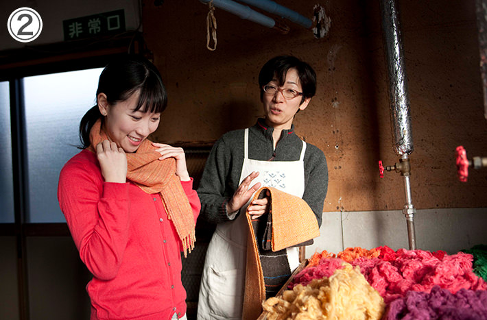 ②Mufflers with muted colors can be created by mixing these colors. I was given a tour of the workshop with Mio Watanabe of Michinoku Akane-kai.