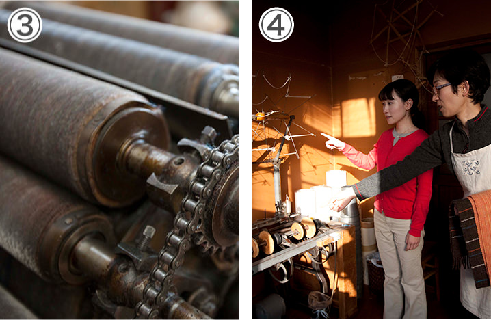 ③④The wool is carefully loosened, the thread is spun, and the thread is wound. Everything is done by hand, and the machines that have been used for a long time are also repaired and used with care.