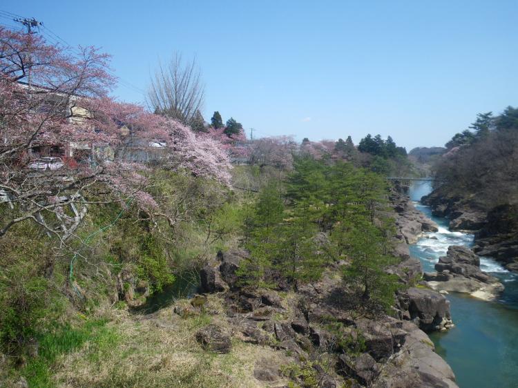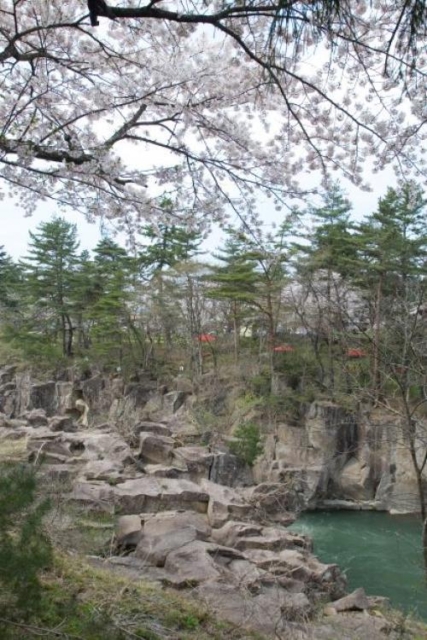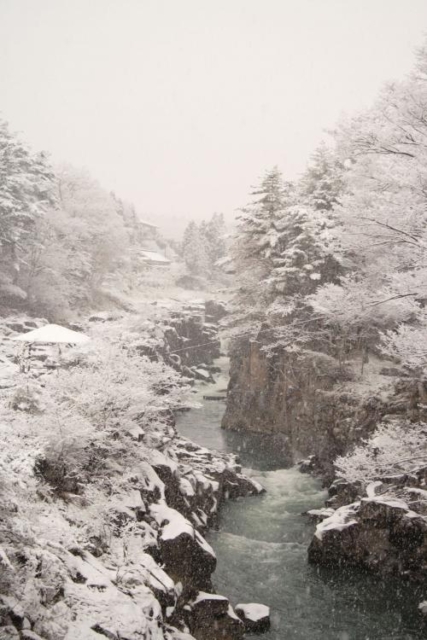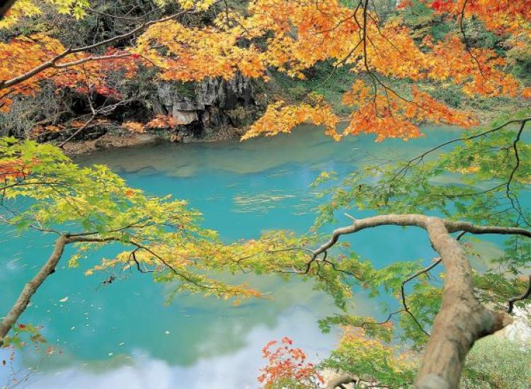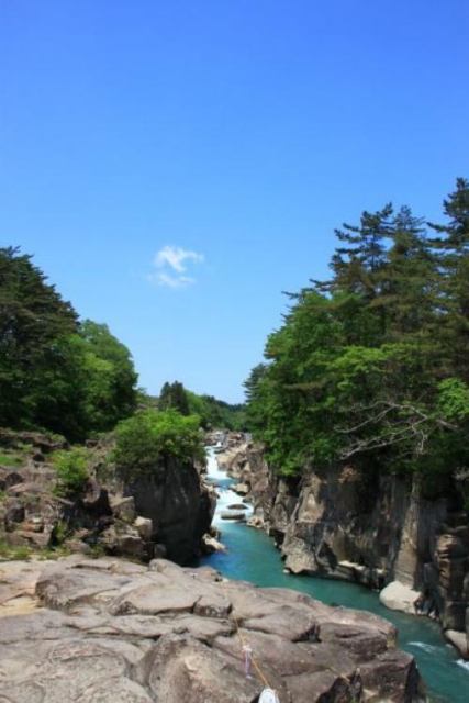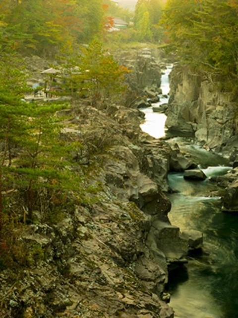 Kurikoma, is a scenic beauty and a natural monument. Iwai River, which flows from its source at Mt. Kurikoma, erodes huge rocks, creating a 2-km-long gorge with a variety of expressions such as a hole, a waterfall, and an abyss. Walking along the promenade, visitors can see from the suspension bridge the contrasting views of the wild upstream flow and the gentle downstream abyss. In spring, visitors can enjoy the beauty of the valley with cherry blossoms in full bloom and melting snow, in summer they can listen to the cool murmur of the mountain stream, in autumn they can see the changing colors of the mountains, and in winter the scenery is reminiscent of an ink painting.