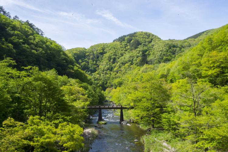 A sightseeing spot rich in nature, it is designated as Kuji Hiraniwa Prefectural Natural Park. The fresh greenery in spring and the autumn leaves in fall are spectacular and provide a place for people to relax. Near Kagami-iwa, there is a famous water called "Furo-sen," which has been selected as one of the 20 best waters in Iwate, and legend has it that drinking it will cure chronic illnesses and prolong one's life. It is also a popular spot for anglers in the summer.