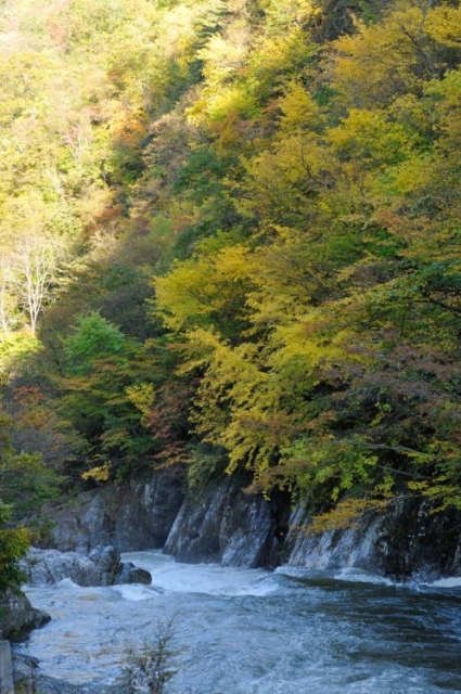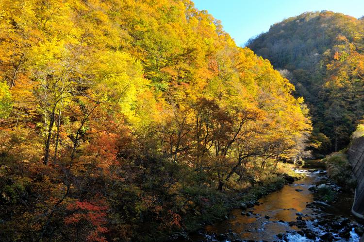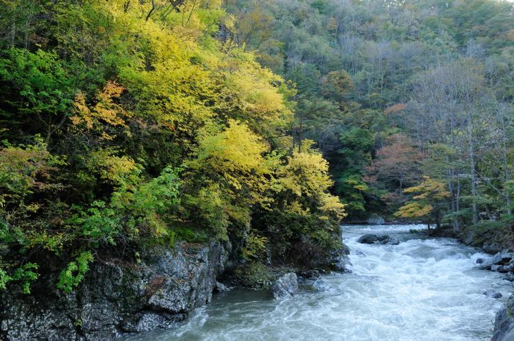 The autumn leaves of konara (Quercus crispula), ash, maple, and other evergreen coniferous trees such as red pine and cedar are reflected in the color of the leaves. A mountain stream along Route 281 leading to Hiraniwa Kogen.