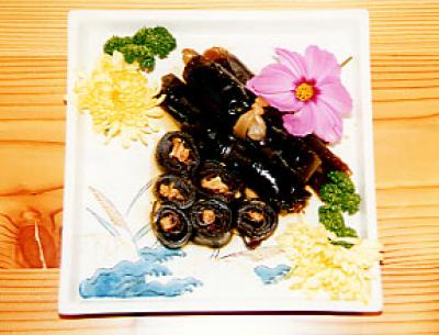 This is a kelp roll made by wrapping salmon in young, one-year-old natural kelp.