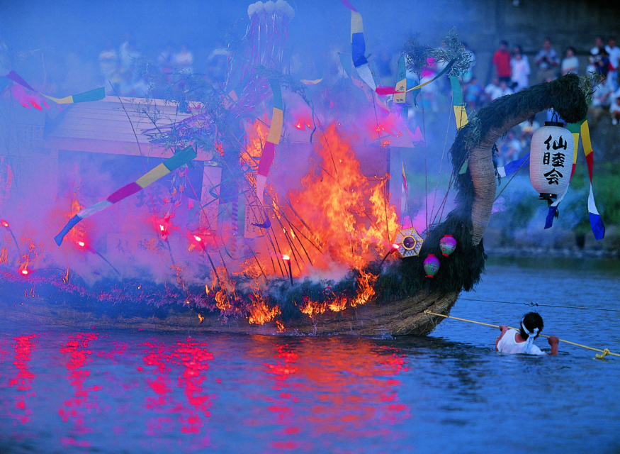北上川の明治橋の辺りで行われるもので、提灯や盆の供物で飾った舟に火を放ち川に流し、祖先の霊を送り、無病息災を祈る送り盆の行事です。およそ240年前、南部藩主・行信の娘が水灯の大法事を行ったのが始まりで、その後北上川で溺れ死んだ遊女の霊を慰めるため、舟に位牌と供物を乗せて流したことと合わせて、以後町の人々の間で盛んに行われるようになりました。盛岡市指定無形民俗文化財。