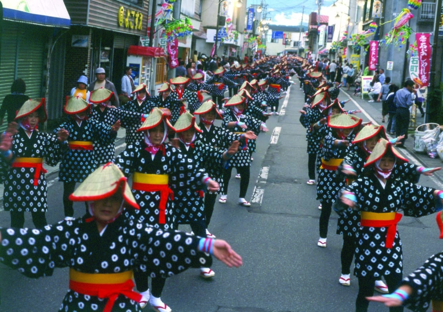 町内最大の夏の行事。京美人の系統を引くといわれる「雫石あねっこ」たちが、濃紺に白いかすり模様の着物に編み笠をかぶった姿で手踊りのパレードを繰り広げます。よしゃれさんさ踊りや神輿運行、YOSAKOI団体による演舞なども行われ、祭を盛り上げます。