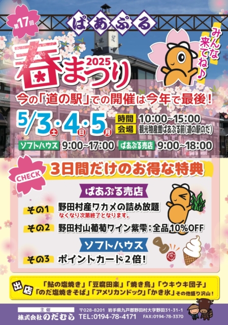 - 〒028-8201 岩手県九戸郡野田村大字野田31-31-1(観光物産館ぱあぷる前)