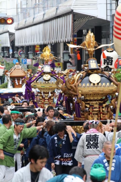 盛岡市及び近郊から神輿が集まりお囃子や木遣りとともに街を練り歩きます。