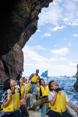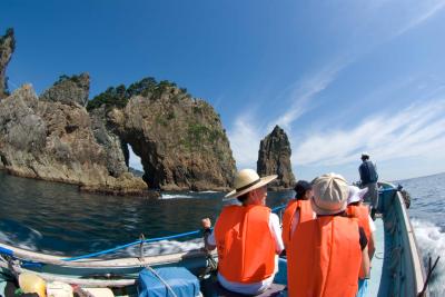 地元の漁師さんが操るサッパ船(小型舟)で北山崎の岩穴をくぐり抜ける迫力満点のクルージングです。(所要時間60分)