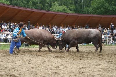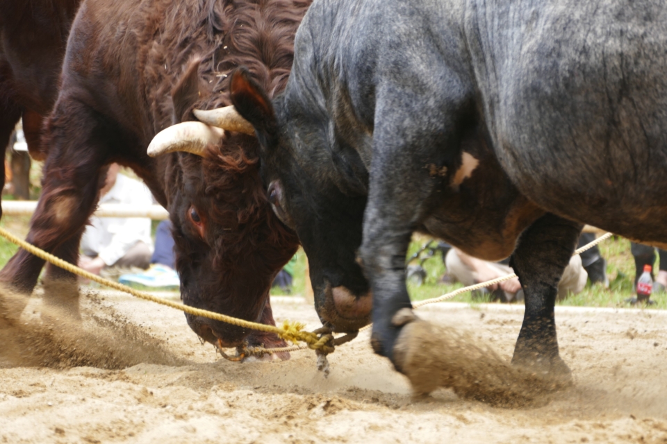 古くから日本短角牛の産地である久慈市山形町(旧山形村)は、東北で唯一の闘牛大会を開催しています。久慈市の闘牛は、塩の道(海岸で焚かれた塩を牛の背に乗せて北上山地を超え盛岡方面まで運んでいた道のこと)の時代まで遡ります。塩の道の先頭に立つ牛を決めるとき、牛の突合せをしたのが闘牛のはじまりとされ、現在は春・夏・秋に久慈市平庭高原で行われています。ぜひ迫力の角突きをご覧下さい。
