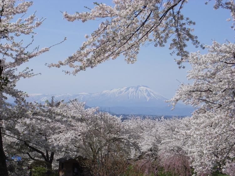 紫波町の小高い山にある城山公園は、春に約2,000本の桜が咲き誇り、山全体が桜でピンク色に染まります。桜が見頃の時期には屋台村がオープンし、多くの人で賑わいます。