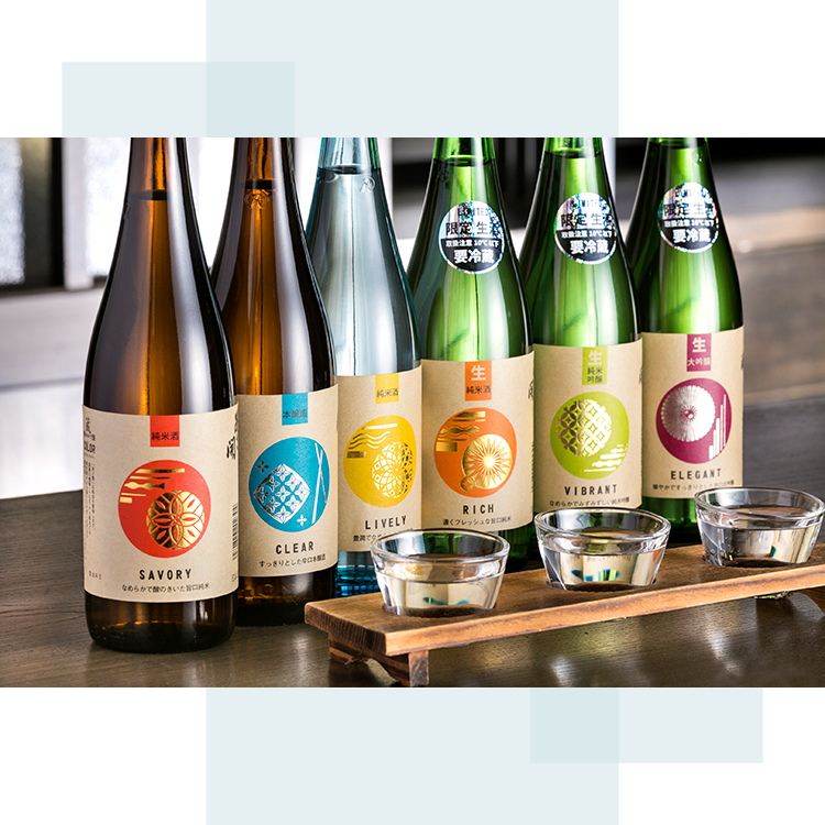 左から、あさ開 蔵埠頭COLOR純米酒・本醸造酒・純米酒・純米生原酒・純米吟醸生原酒・大吟醸生原酒
