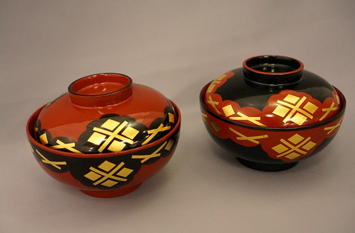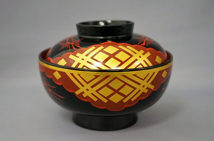 秀衡塗の伝統模様である有職菱文(ひし形)と源氏雲が描かれた汁椀。
