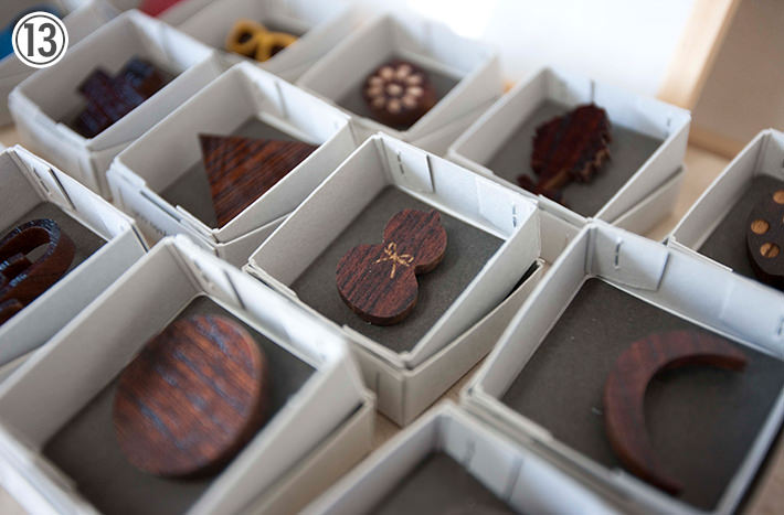 ⑬こちらは、岩谷堂タンス製作所オリジナルの端材を利用したブローチなどの小物。軽くて使いやすく、ユニークなデザインも人気を呼んでいます。