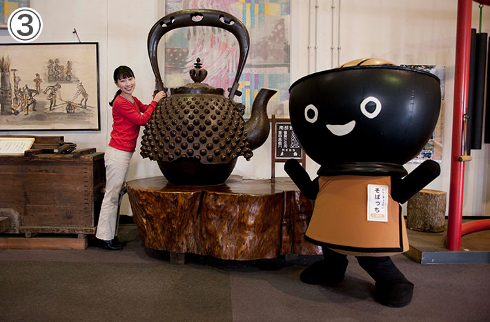 ③ホールには世界一の大きさという大鉄瓶。高さ1.5m、重さ350kg!