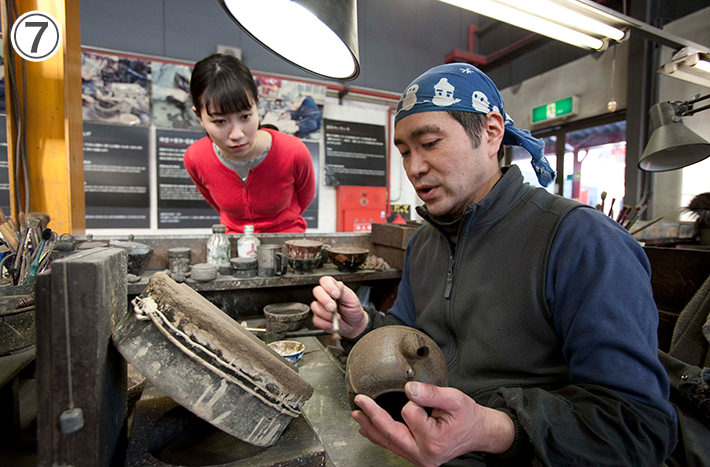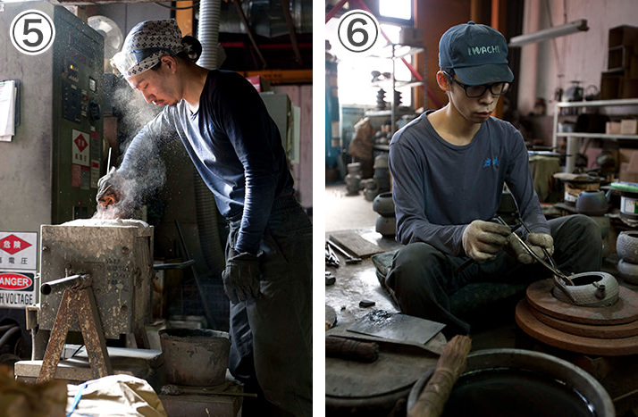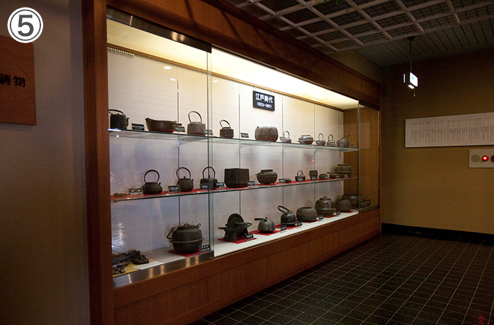 ⑤⑥ホールから次の扉を開けるとそこは鉄器製造の工場でした。実際に職人さんたちの仕事を見学することができます。ひとつの鉄瓶を作るのに64から68の工程があるのだそうです。そのほとんどを手作業で行います。