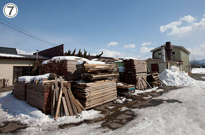 ⑦工房の前には材料となる木材。何年もかけて乾燥させます。