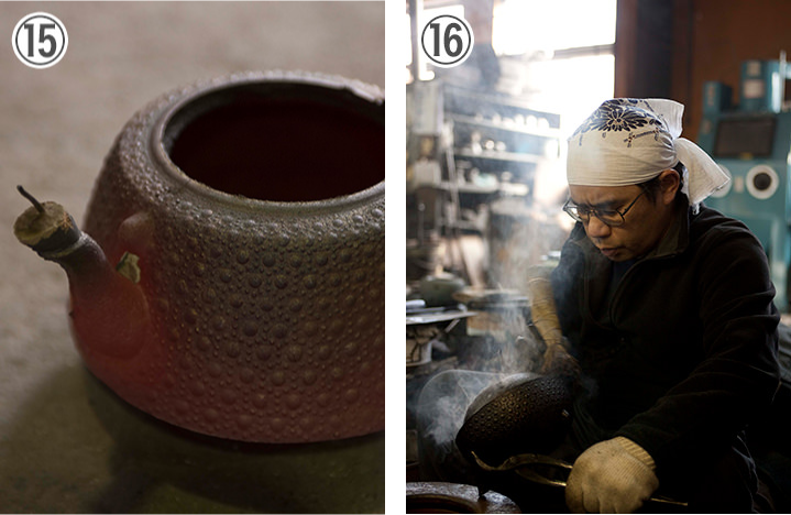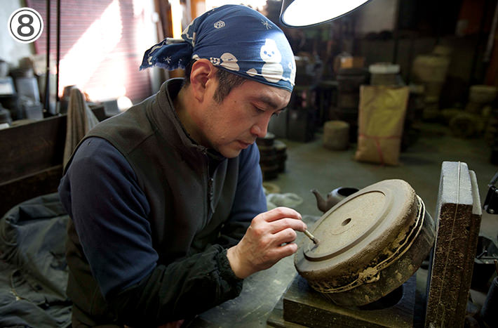 ⑧この作業は、北上川の川砂と粘土で鉄瓶の底の型を作っているところ。鉄瓶の底は平坦ではなくざらっとした小さな凹凸がありますがそのざらつきの加減も職人によって違うのだそうです。機会があったら見比べてみてください。