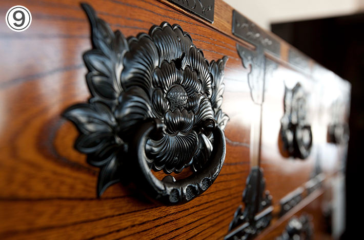 ⑨木目の美しさ、漆の持つ風合いと光沢、金具の重厚さが岩谷堂箪笥の魅力。