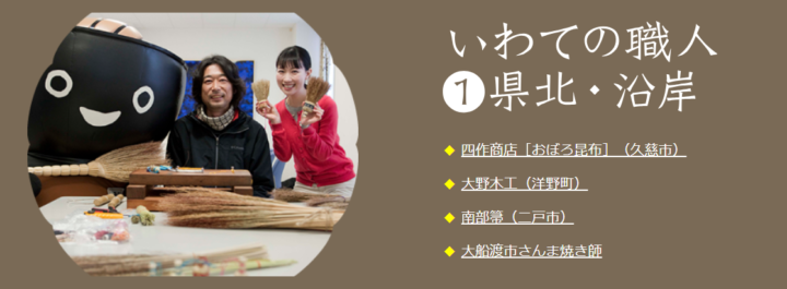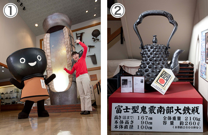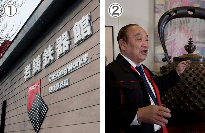 ①岩鋳鐵器館は伝統の意匠南部鉄器展示ギャラリーのほか鉄瓶製作の作業工程を見学できる工場です。 ②岩手の伝統工芸品「南部鉄器」を販売している「株式会社岩鋳」の赤平憲生さん。