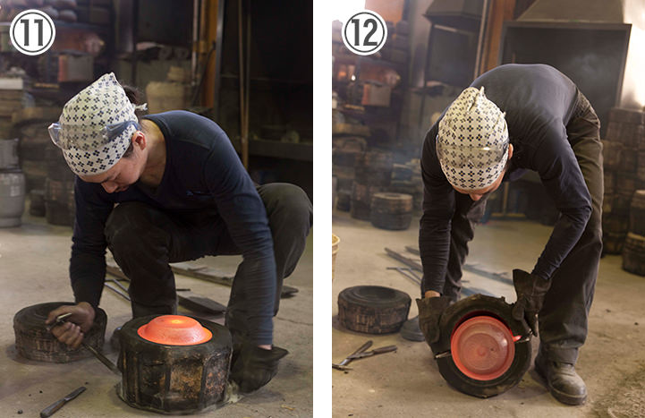 ⑪⑫鋳込んだ鉄が固まり、鋳型から引き出すところ。