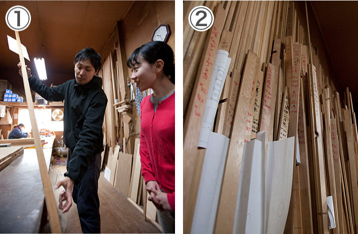 ①②こちらにたくさん立てかけてある薄くて細長い板は全て箪笥の図面だそうです。1枚の板の裏表に記載されている寸法通りに木取りと呼ばれる箪笥枠や引き出し用などの材料から作業を進めるそうです。