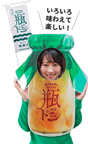 三陸の海の幸など自慢の食材がギュッと詰まった見た目もカラフルでユニークな新たな宮古のご当地グルメ。瓶の中身を自分でご飯にかけて食べるスタイルなので少しずつかけるもよし、全部かけるもよし、盛付けを楽しみながらいただくことができます。