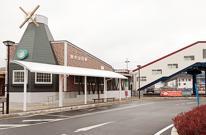 震災で大きな被害を受けた陸中山田駅の駅舎が「リアス線」開通に合わせて新しくなりました。山田町のシンボル「※オランダ島」にちなんで風車がデザインされています。