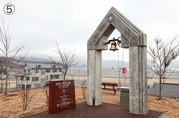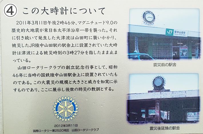 ビルの外壁の濃い色の箇所まで津波がきたそうで、7〜8mほどの高さとのことです。そこから5分程歩いて、海や町の姿を見渡すことができる標高10m程の御蔵山(おぐらやま)へ足を伸ばしました。そこには津波により被災した陸中山田駅に設置されていた大時計が展示されています。津波到達の時刻3時27分を指したままになっています。そばには、震災前と震災後の駅の写真を用いた解説のボードがあり被害の大きさを物語っています。山田の海と移り変わる町を見渡せる同地には鎮魂と希望の鐘があるほか※慰霊碑も建立されました。