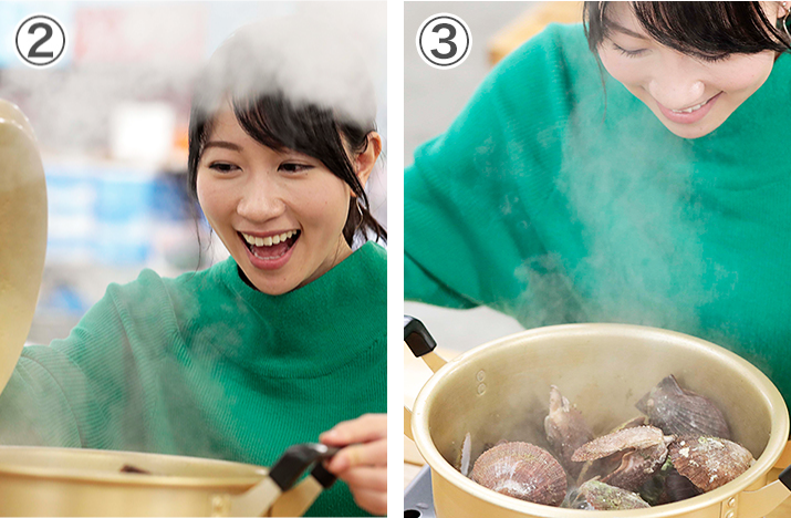 ② レンタルの鍋で貝を蒸します。 ③ 蒸し上がりました!