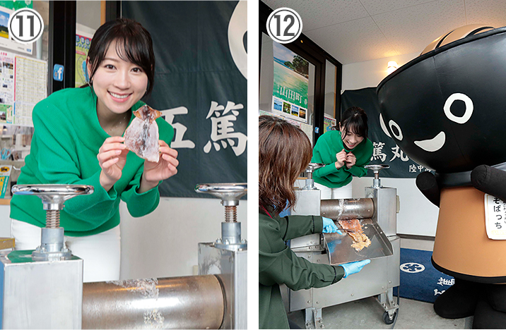 ⑪⑫ いかをのしちゃおう体験。干したスルメイカをのし機に入れます。ハンドルを回すと、、のしいかができました!