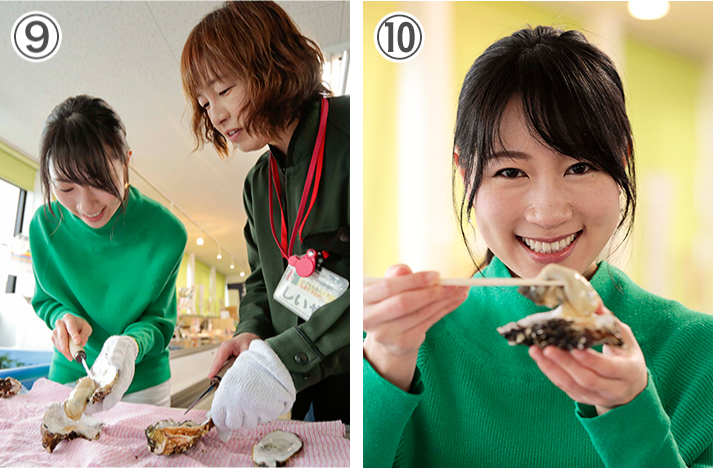 ⑧牡蠣の殻剥き体験。専用のナイフで殻を外します