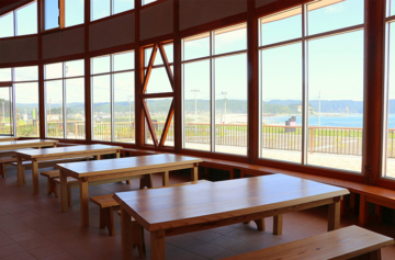 ユニークな屋根は寄贈されたヒノキ材100本余をふんだんに使用。休憩室内の壁は、ホタテの貝殻が原材料の塗り壁になっています。