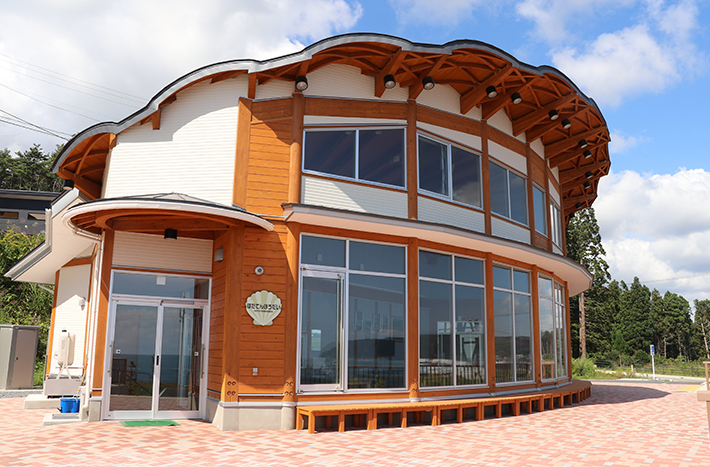 野田村特産のホタテをモチーフにデザインした展望休憩施設「ほたてんぼうだい」は、2017年オープン。翌年2018年3月に建てられた東日本大震災の大津波記念碑、また昭和津浪記念碑が建つ屋外展望台からはゆるやかな弧を描く景勝地十府ヶ浦を望むことができます。