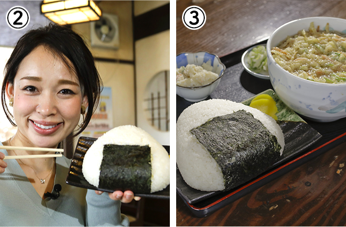 ②見ているだけで嬉しくなるこの大きさ!かぶりつくと熱々のお米がしっかり、でもホワッと口の中でほぐれます。