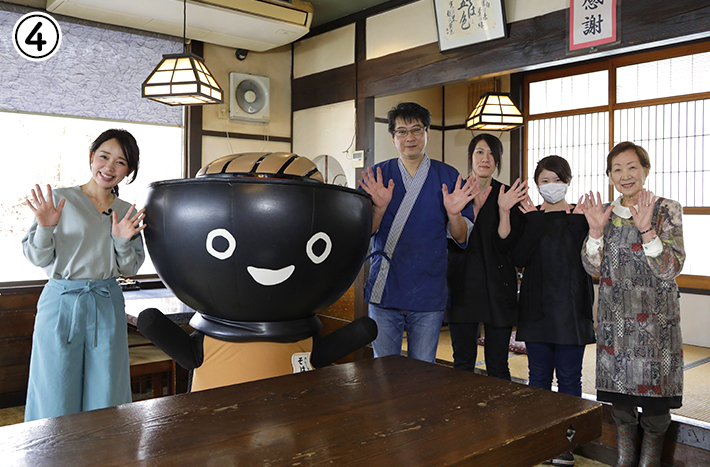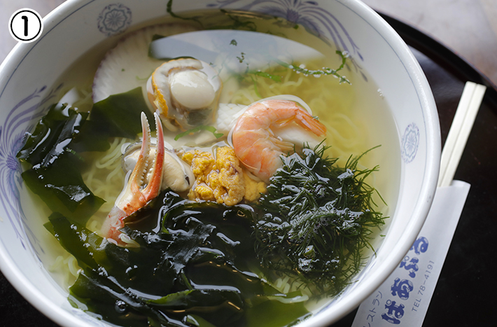 ①人気の「レストランぱあぷる」は、地元のお母さんたちが運営している農家レストラン。こちらは海鮮たっぷり、細ちぢれ麺が上品な塩スープと相性ばっちりの「ぱあぷるラーメン」。
