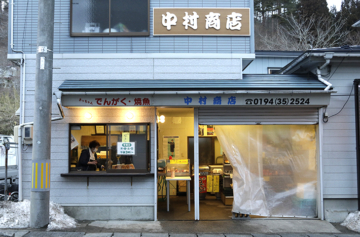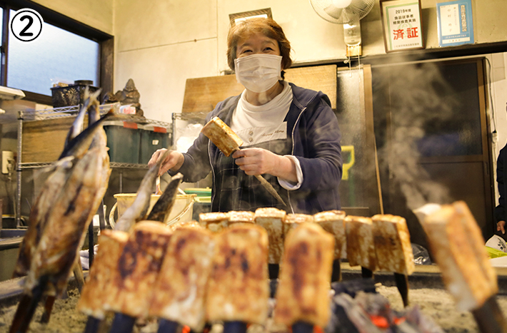 こちらは香ばしい炭火焼の匂いがたまらなくそそられる「さっちゃん田楽」こと中村商店。焼きたてをいただけるのが嬉しい!にんにくの効いた味噌がしっかりとした豆腐によく合い、元気の出る味、体もポカポカに温まります。豆腐の他にサバなども焼いて販売しており、地元の方に評判のお店です。