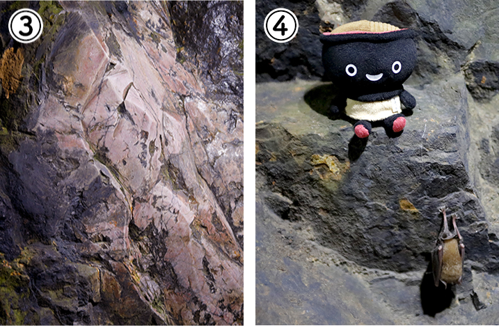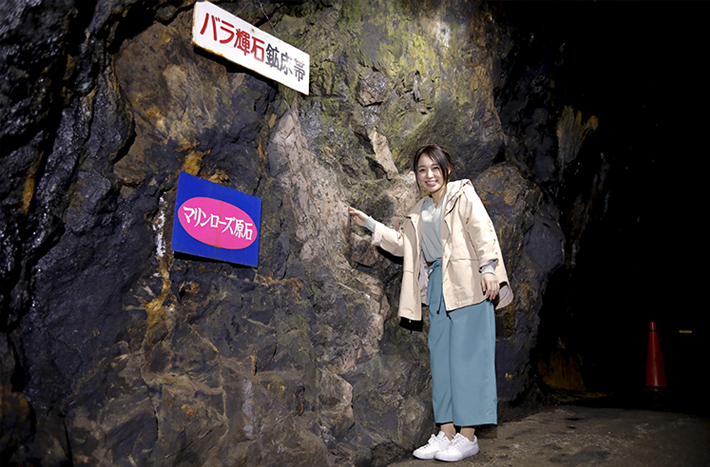 ③坑道の奥では、バラ輝石の大きな原石を見学できます。ドラマチックな美しいローズ色!