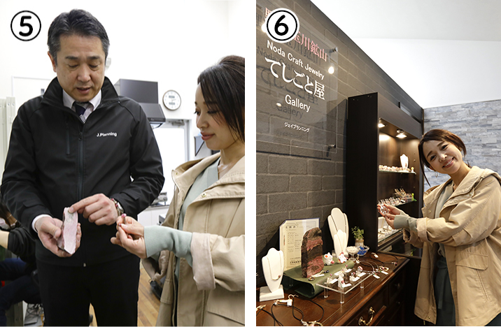 国内唯一、野田村でしか採掘されない貴重な原石「バラ輝石」は、宝飾用のマリンローズとしてアクセサリーなどに加工されています。その加工、販売を手掛けている「てしごと屋本店ショップ」では、マリンローズの加工製品、アクセサリーを購入できるほか、アクセサリー作り体験も行っています。