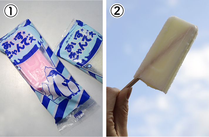 ①冷凍ケースいっぱいに並んでいたのが、大人気の「あいすきゃんでぇ」。赤(いちご味)、白(サイダー味)2種類の、素朴で懐かしい味。