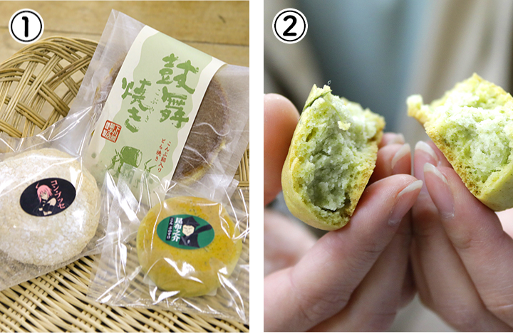 ②「昆布之介」(写真①右下)は、割るときれいなグリーンの餡に刻み昆布が顔を出します。