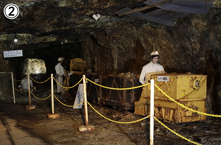 日本有数のマンガン鉱床だった野田玉川鉱山の一部を観光坑道として公開しています。坑道内では、様々な原石、鉱物、化石の展示や、当時の採掘の様子が機械や人形展示でリアルに再現されており、鉱山の歴史を知ることができます。