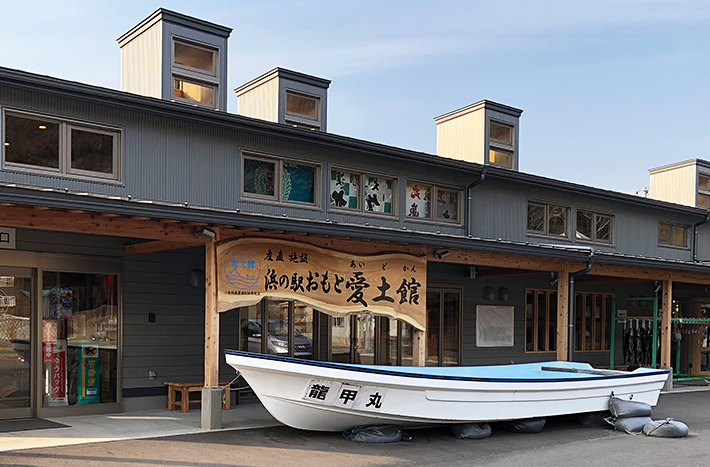 入り口でお客様を出迎える白い「龍甲丸」が目印。観光客と地元の人たちの交流・休憩場所として愛されている「愛土館」は、「一緒に行きましょう」を意味する地元の方言「あいどがん」にちなんで命名されました。