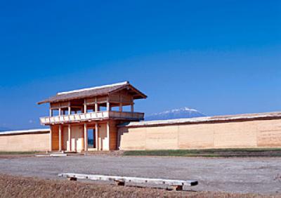 육오국 최북단의 고대 성 울타리. 시바성터의 남변에 약 1200년전에 축성되었을 때의 모습이 복원되어 중앙에 배치한 남문은 문구 15m, 깊이 6m, 높이 11.1m 있어, 헤이조 궁터 주작문에 이은 ​​대규모 게이트. 그 양측 각각 126m에 흙을 층상으로 굳힌 츠키지담을 둘러싸고, 담 위에는 야구라를 짜고 있다.