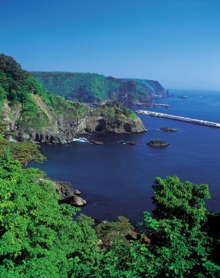 전망대의 해안 반도가 곰의 머리와 코끝을 닮았기 때문에 이 이름이 붙었다. 송림이 있는 절벽의 곶이 3개 줄지어 있는 것이 보인다.