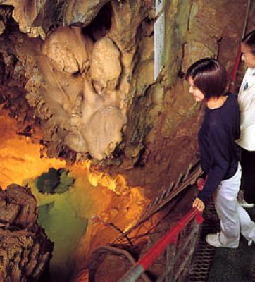 約3億5千万年前の地歴を誇り、天井から壁一面に生成されたフローストン(鍾乳石)、つらら石、石筍、洞穴サンゴや、エメラルドグリーンの地底湖がある。