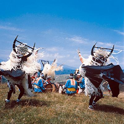 県内各地で踊られる鹿踊は、踊りの様式から大別して太鼓踊り系(県南地方)と幕踊り系(県北地方)に分けられる。太鼓踊り系は1~3mの長いササラ竹を背負い、腹に太鼓を下げ、太鼓を打ち鳴らしながら踊り、鹿面の大きいのが特徴。幕踊り系は、両手に幕を下げ、笛や太鼓のハヤシが別について踊るもので遠野鹿踊り以外は鹿の面も小さい。太鼓踊り系の起源は、奈良の春日大社の神事に由来し、村の平安を祈願し、悪霊を追い払う行事の舞踊化されたものといわれ、現在のような装束は江戸時代からのものと思われる。日出神社まつり・お伊勢まつり・南部神社まつり・遠野八幡宮まつり。