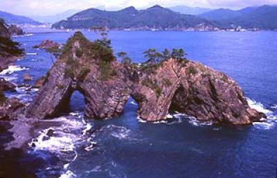 碁石海岸を代表する景観です。海水の浸食によって岩の基底部分に大きな穴が3つ開いている奇岩で、自然の造形の巧みさに驚嘆させられます。また、小型遊覧船でこの穴をくぐり抜けることもできます。